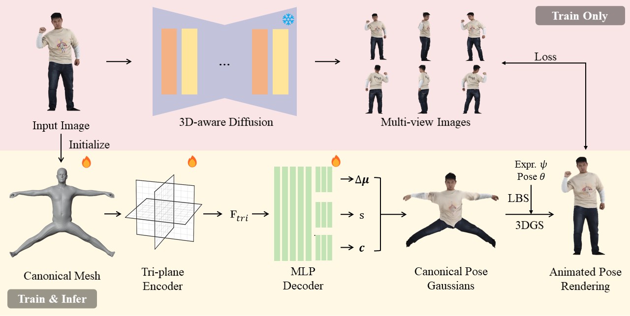Overview of SIAvatar. Given a single image input, SIAvatar leverages diffusion-based appearance prior and SMPL-X geometry prior to regress the 3DGS representation of a 3D human avatar. During the inference stage, SIAvatar animates the 3D avatar by applying LBS to the 3D Gaussians using SMPL-X facial expression and pose parameters, and then renders the avatar as 2D images in arbitrary views.